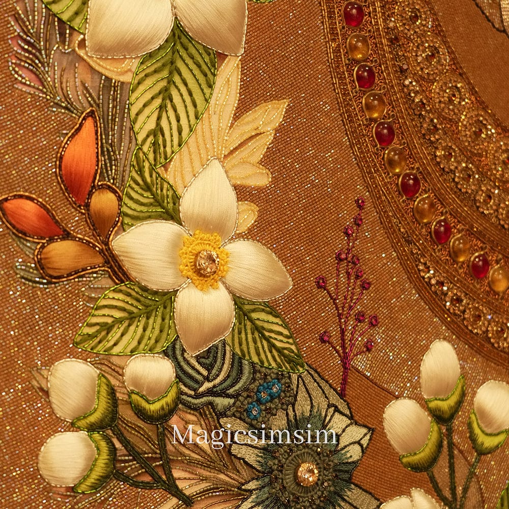 Every minute element of this exquisitely detailed art is hand embroidered on a pure raw silk base using the finest of components and heritage hand embroidery techniques by inter-generational master artisans and thus creating timeless bejewelled heirlooms evoking ancient Indian royalty. In the serene embrace of ancient mythology, Nandi stands as the unwavering vahana of Lord Shiva