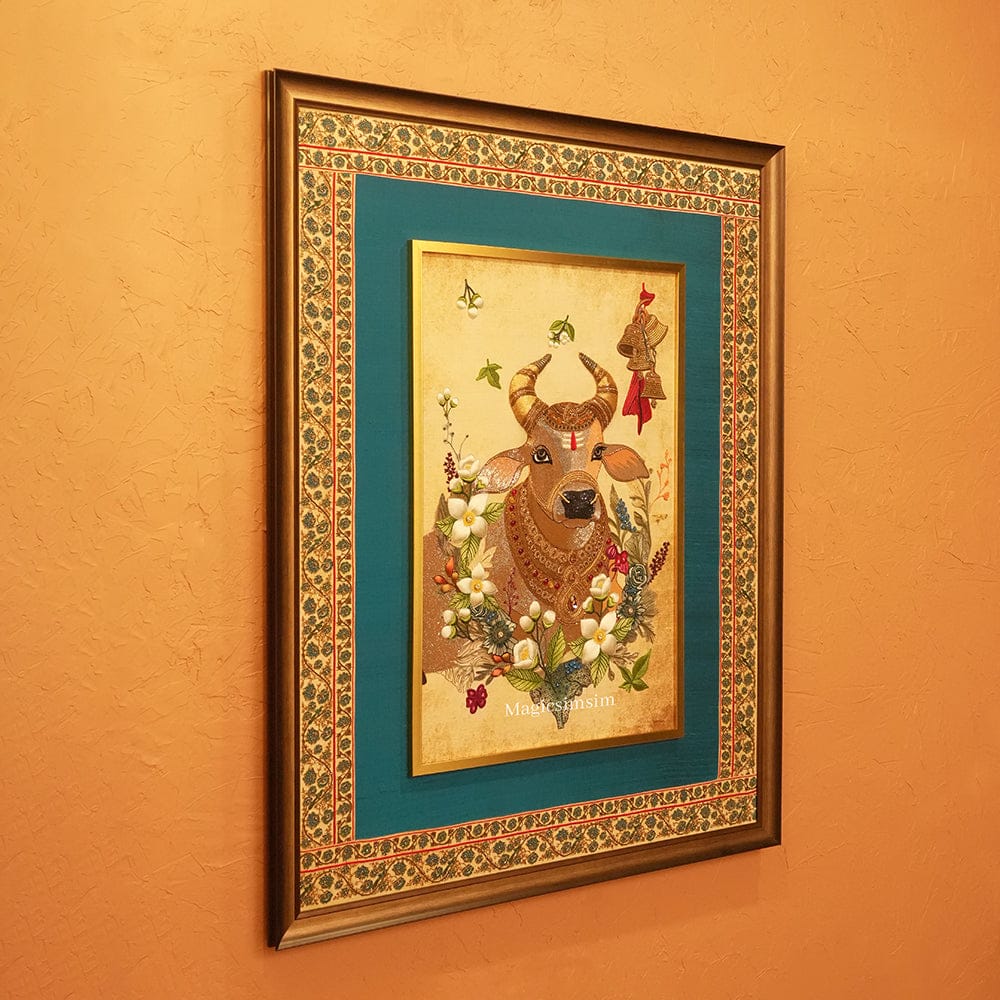 Our precious bejewelled “Nandi” artwork depicts the sacred bull in opulent detail, adorned with cascading floral garlands, shimmering jewels, and resonant bells that evoke the whispers of eternal prayers.